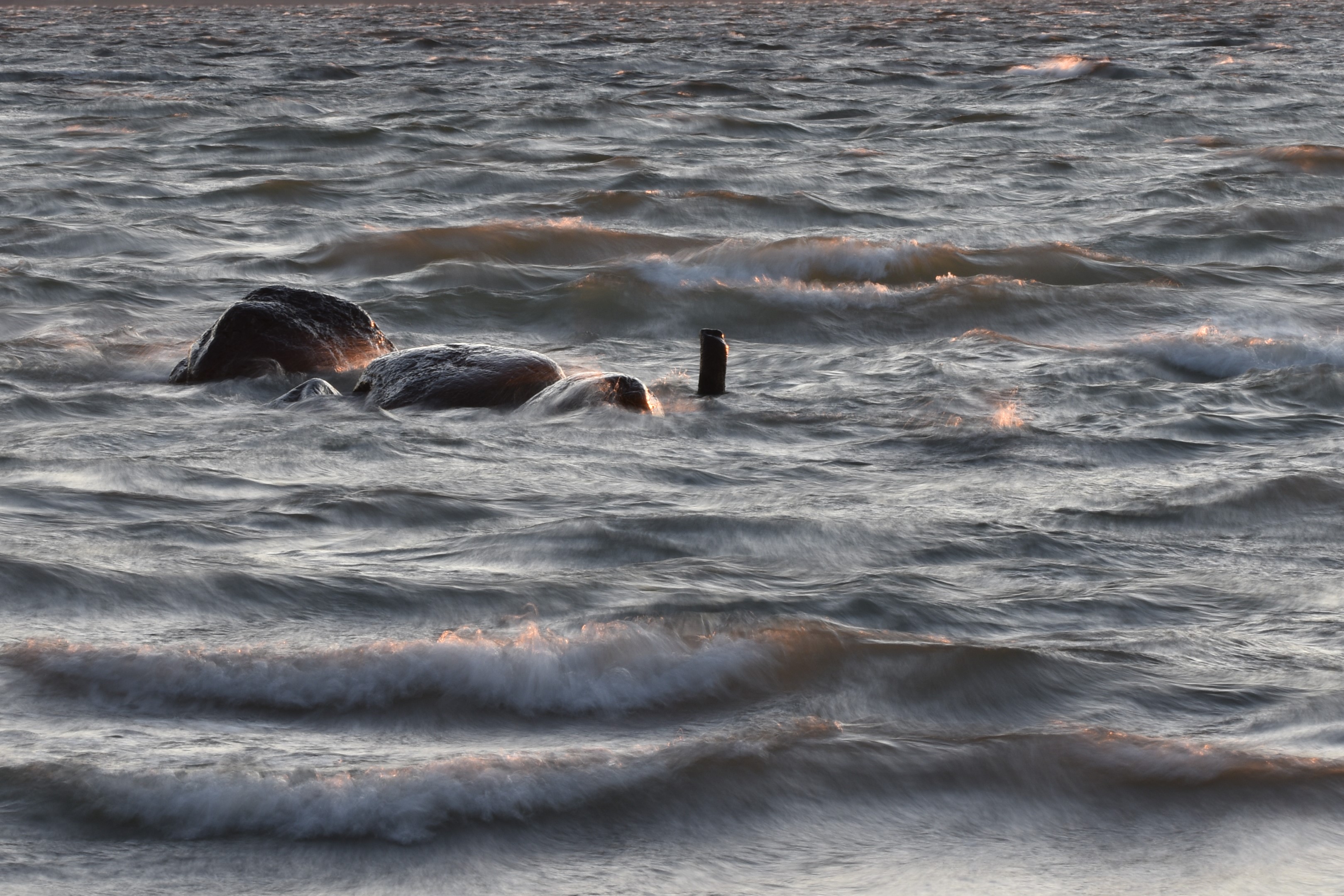 Foto on tehtud Katariina kai juures. Roosast päiksetõusust hoolimata näitas meri oma karmi palet