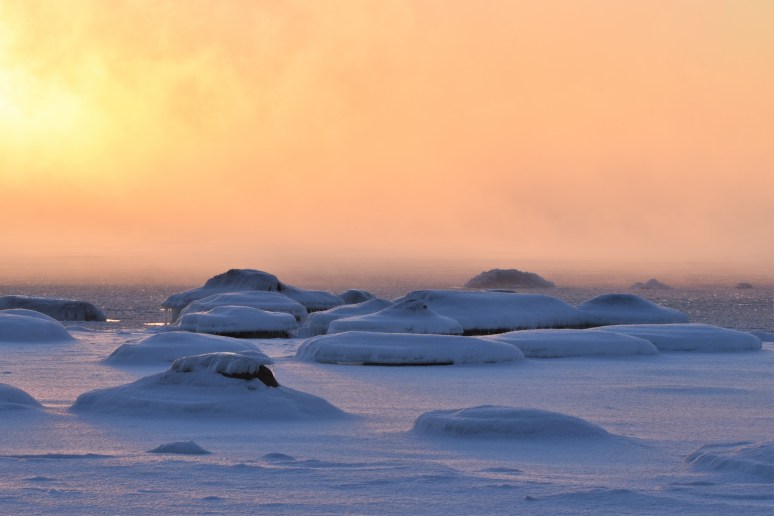 Paar päeva tagasi käisime päikesetõusu ajal mere ääres. -18-kraadine pakane pani mere aurama ja kui tõusev päike sellest läbi paistis, siis avanesid imelised vaated.