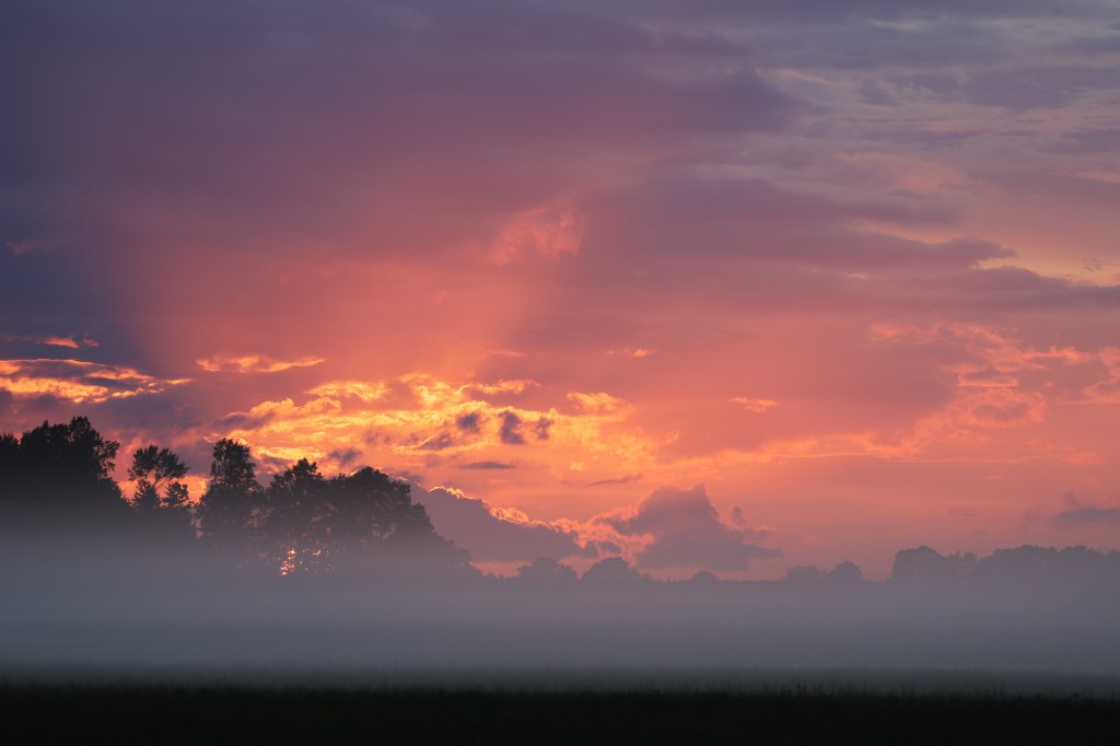 Pärast pikka sadu piilus päike korraks pilvede vahelt ja loojus siis uduste väljade rüppe.