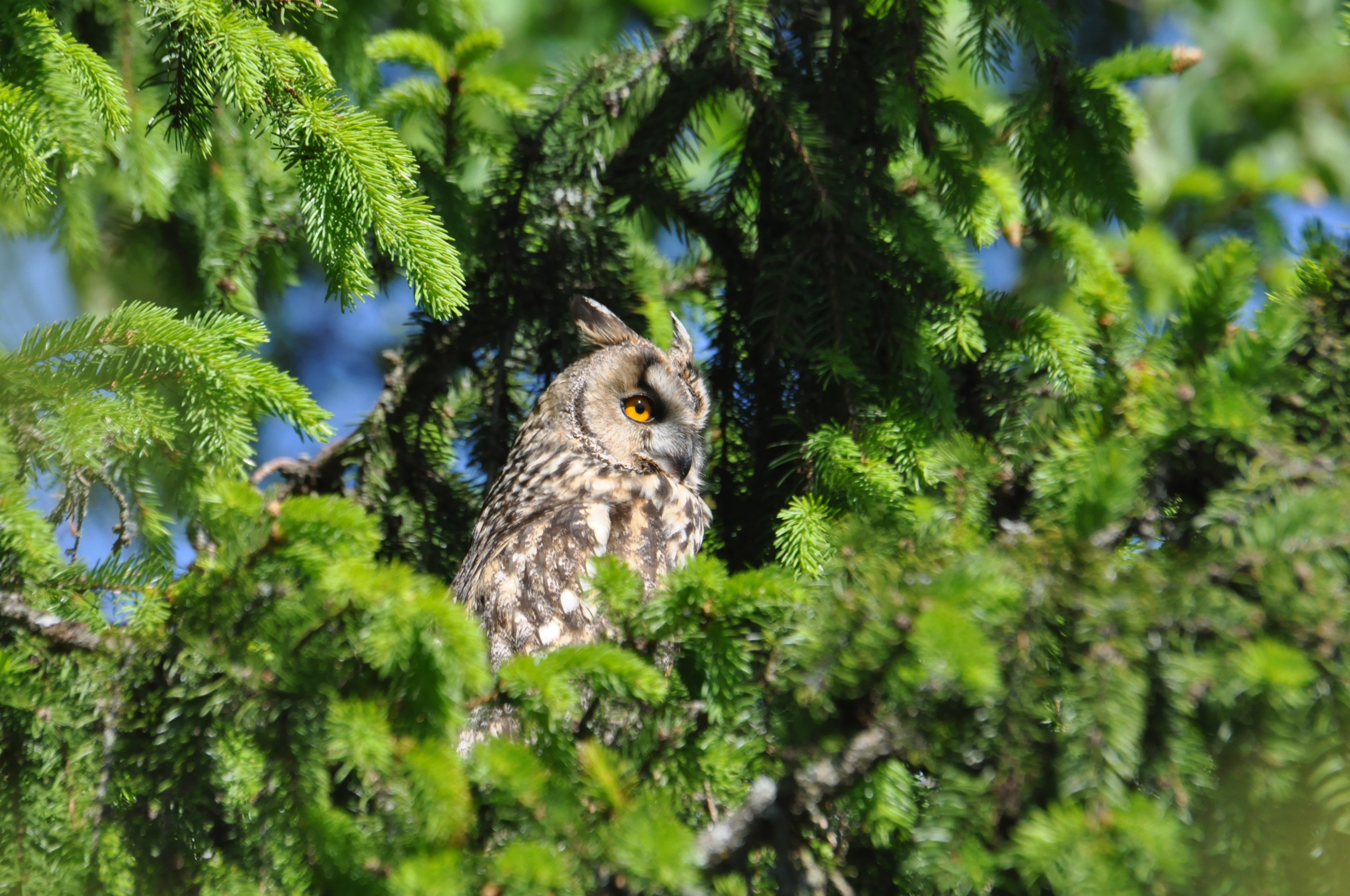 Sellel aastal suvatseb meie maamaja aias pesitseda kõrvukräts. Möödus mitu nädalat, enne kui mul õnnestus temast foto saada. Tavaliselt märkas räts mind esimesena, hüüdis pea kohal õrnalt “huu” ja lendas järgmise kuuse otsa. Seal ta siis passis mind ja itsitas tasakesi. Sellel nädalavahetusel märkasin mina teda esimesena. Räts suges rahulikult oma sulgi ja ei pannud tähelegi, kui kadakate kohale kerkis fotoobjektiiv…